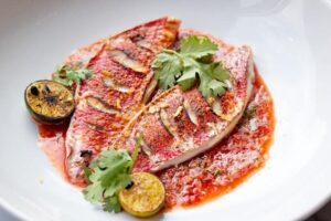 The red mul has flavorful, firm meat with moderate fat content. It is easy to fillet, and due to its firmness, it can be very well fried and grilled, making it a favorite for the barbecue. Because of its size of around 25 centimeters, it can be prepared whole for one person. Traditionally, the mul is often combined with Mediterranean products such as tomato, garlic, olive oil, and Provençal herbs, whether wrapped ‘en papillote’ or not. Timo Kok from Bobbi’s Bar in Breda shows that it also lends itself very well to an Asian twist.