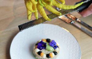 A favorite dish on the Metro City Kitchen menu is raw sea bass with sweet potato, avocado, and Buddha’s Hand. Rens: “This dish has a fine combination of sweet, fatty, acidic, and crispy. We finely slice the raw sea bass and dress it with some pepper, salt, and olive oil. The bulgur is boiled and prepared with a vichyssoise. We roast the sweet potato in the oven and then blend it in the thermoblender, finishing it with pepper, salt, and xanthan. We also blend the avocado. For the squid ink mayonnaise, we make a mayonnaise with squid ink. The spicy accent in this dish comes from freshly grated horseradish, which we stir into yogurt that we have drained for 24 hours. For the crispy element, we make filo pastry with green herbs, which we cut out and incorporate in layers into the dish. The dish is finished with purple violets. As a finishing touch, we shave some Buddha’s Hand over the dish at the table. Guests are surprised by the unique shape of the “hand” and by the delightful citrus aroma.”